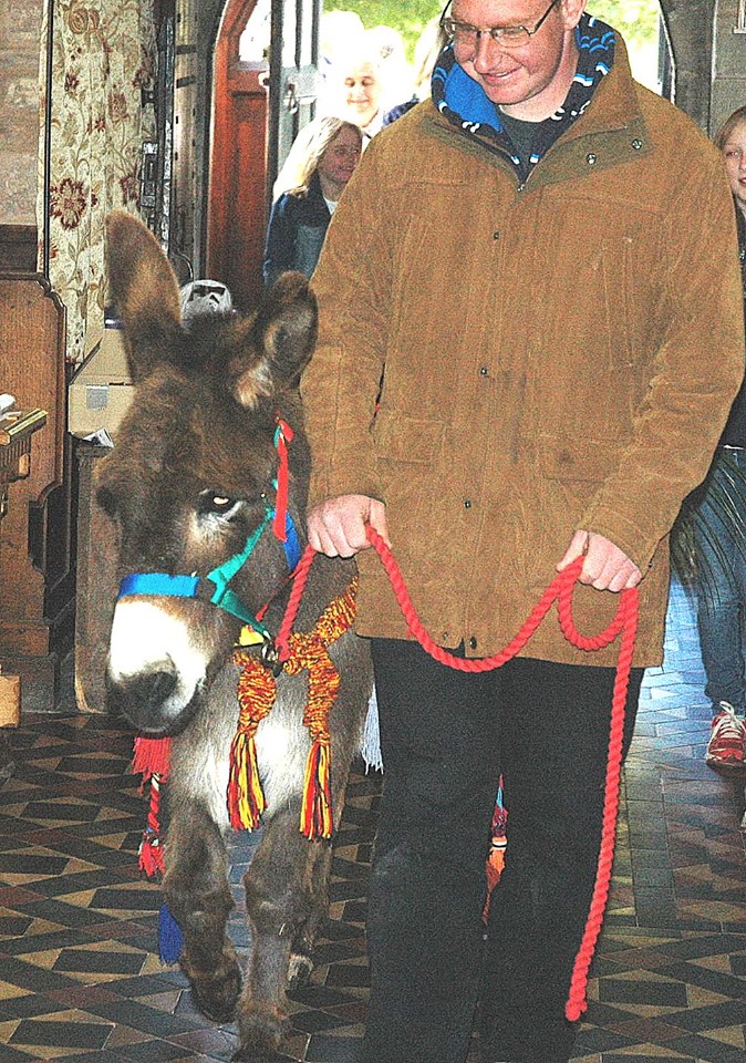 Cliff leads the donkey into church